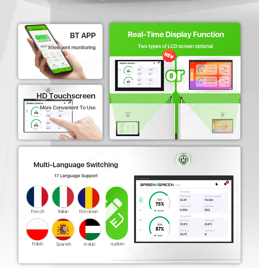 - 📱 App + Touch UI: optional touch screen, Bluetooth/Wi-Fi app, multi-language interface, and SOC light bar for at-a-glance status.